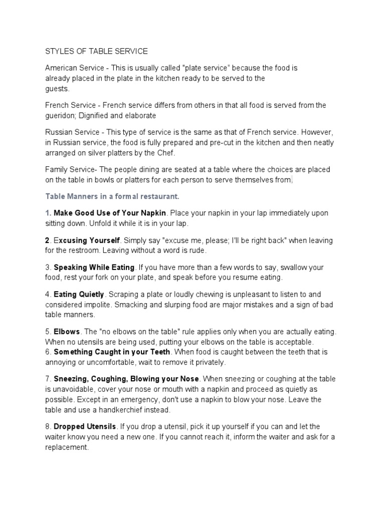 Table Manners In A Formal Restaurant 1 Make Good Use Of Your Napkin Place Your Napkin In Your Lap Immediately Upon Pdf Food And Drink Foods